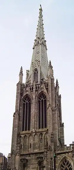 Der Grundstein für die neue Kirche wurde 1843 gelegt; drei Jahre später wurde sie geweiht. Grace Church ist ein Gebäude im neugotischen Stil aus Sing Sing Marmor.[6] Gemeindeprotokolle aus dem Januar zeigen die Kosten für die neue Kirche. Die Einträge reichen von den Ausgaben für die Arbeiter aus dem Staatsgefängnis Sing Sing, die zur Bearbeitung der Steine eingestellt worden waren, bis zu den Stickereien auf dem Altartuch. Die Grace Church hatte ursprünglich einen Holzturm, aber unter der Leitung des Rektors Henry Codman Potter wurde er 1881 durch einen Marmorturm ersetzt, der ebenfalls von Renwick entworfen wurde.[6] Der heutige Turm ist 70 m hoch.[8] Das Innere der Kirche ist vorwiegend auf Putzmörtelträgern aufgebaut.[9]