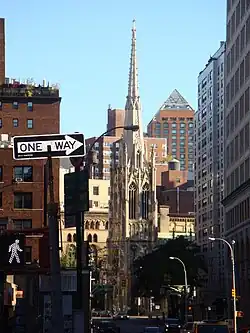 Die erste Kirche der Gemeinde 1808 am Broadway und der Rector Street gebaut.[6] Da die Bevölkerung New Yorks sehr schnell wuchs, beschloss die Gemeinde, die Kirche in das Stadtzentrum zu verlegen. 1843 kaufte Henry Brevoort das Grundstück, auf dem sich das Gebäude heute befindet. Mit dem Bau beauftragt wurde der 23-jährige Architekt James Renwick Jr., ein Neffe Brevoorts, dessen einzige abgeschlossene Arbeit damals der Springbrunnen im Bowling Green Park war.[7]