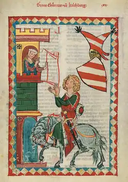 - Konrad von Kirchberg: Konrad ist auf der Miniatur 24r der Großen Heidelberger Liederhandschrift als Ritter (Graue Chunrat vo Kilchberg) abgebildet, der hoch zu Ross seiner Angebeteten ein Gedicht überreicht. Überliefert sind 22, in drei Sommer- und in drei Winterlieder gegliederte Liedstrophen, die motivlich und formal an Neidhart und den Tannhäuser erinnern.[5] Die historische Person ist unsicher; es handelt sich entweder um Konrad, (urkundlich zwischen 1255 und 1268) oder um dessen gleichnamigen Sohn (urkundlich zwischen 1286 und 1315).[5]