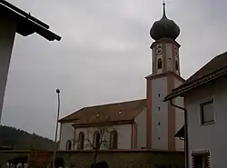 Am Westrand des die Kirche umgebenden Friedhofs stehen ein denkmalgeschütztes Kramerhäusl, ein zweigeschossiger und giebelständiger Schopfwalmdachbau mit Blockbau-Obergeschoss, Umlaufschrot und Giebellaube aus dem 18. Jahrhundert (Denkmalnummer D-3-72-146-21)[40] und das ehemalige Schulhaus, ein zweigeschossiger und traufständiger Satteldachbau mit verschindeltem Blockbau-Obergeschoss, erbaut im 18. Jahrhundert, Umbau im späten 19. Jahrhundert (Denkmalnummer D-3-72-146-20).[41]