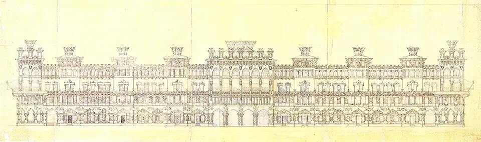 Als geeignete Stelle für das Gebäude erwies sich ein aufgefülltes Hafenbecken am neuen Passeig de Colom. Das Hotel im neugotischen Stil bestand aus Erdgeschoss und drei Obergeschossen und maß 150 auf 35 Meter. Es besaß 600 Zimmer und 30 Familienappartements und bot insgesamt 2000 Gästen Platz. Der Speisesaal war für 350 Personen ausgelegt.
