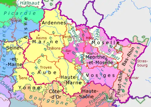 - ↑ Décret n° 2016-1262 du 28 septembre 2016 portant fixation du nom de la région Grand Est auf legifrance.gouv.fr. Abgerufen am 1. Oktober 2016.