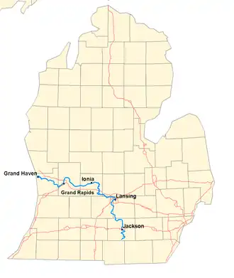 Nebenflüsse sind Red Cedar River, Looking Glass River, Maple River, Flat River, Thornapple River und der Rogue River.