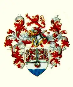 In einem silbernen Schild befindet sich mittig ein schwarzer bis über den halben Schild herabreichender Waagebalken, der unten mit einem goldenen Ring versehen ist. Der Waagebalken wird von zwei auf ihm stehenden roten Löwen im Gleichgewicht gehalten, indem sie den senkrechten schwarzen Waagegriff mit den Vorderpranken halten. Unter der Waage ein roter Halbmond über blau gewelltem Schildfuß. Auf dem Helm mit rot-silbernen Helmdecken ein wachsender roter Löwe.[6]