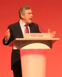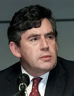 Während seine Biographen Blair als seltsam wurzellos und schwer einzuordnenden Charakter ansehen, war Gordon Brown fest im schottischen Klerus, dem schottischen Bildungssystem und nachfolgend auch der schottischen Politik verwurzelt.[7] 1951 geboren in Glasgow, zog seine Familie nach Kirkcaldy in Fife um, als der junge Gordon fünf Jahre alt war. Sein Vater war ein Pfarrer in der Church of Scotland und prägte seinen Kindern das Ideal eines christlichen Sozialismus ein.[8] Nach dem Besuch einer Grammar School wurde er mit nur 16 Jahren an der Universität Edinburgh zugelassen;[9] zu Ende seiner Schulzeit erlitt er bei einem Rugbyspiel eine Netzhautablösung. Trotz mehrerer Operationen erblindete er auf dem linken Auge und musste mehrere Monate in einem abgedunkelten Raum liegen, um zumindest das zweite Augenlicht zu retten.[10] Danach war er in den Augen verschiedener Historiker noch entschlossener und zielstrebiger.[11] Bereits während des Studiums begann er, sich politisch zu betätigen, und wurde Editor einer Universitätszeitung.[12] 1972 graduierte er als Master of Arts in Geschichte und blieb weiter an der Universität, um zu promovieren.[13] Parallel dazu verwendete er viel Zeit und Energie darauf, in der schottischen Labour-Partei seinen Weg zu suchen, die in dieser Zeit im Vergleich zu ihrer Schwesterorganisation in England viel weniger radikal war. Ideologisch war Brown ein typischer Vertreter der schottischen Labour-Partei: Er sah sich als Verfechter des Egalitarismus, der zwar ein gleiches Einkommen für alle als unrealistisch und nicht zielführend ansah, jedoch für gleiche Bildungschancen und Mindestlöhne eintrat.[14] 1983 sicherte er sich durch die Unterstützung einer Gewerkschaft den sicheren Labour-Wahlkreis Dunfermline East.[15]