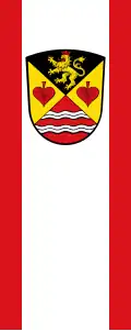 Flaggenbeschreibung: „Auf weißen Flaggentuch mit roten Randstreifen im oberen Drittel aufgelegt das Gemeindewappen.“[30]