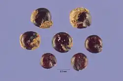 Die häutige Fruchtwand (Perikarp) ist gelb-weiß. Die dunkelbraunen oder rotbraunen, abgeflacht kugeligen Samen weisen einen Durchmesser von etwa 0,75 mm auf. Die Samenschale ist fein grubig punktiert bis netzadrig[3].