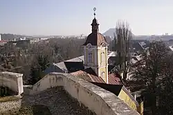 Aussicht vom Grazer Kalvarienberg mit Kalvarienbergkirche und Grazer Schloßberg im Hintergrund
