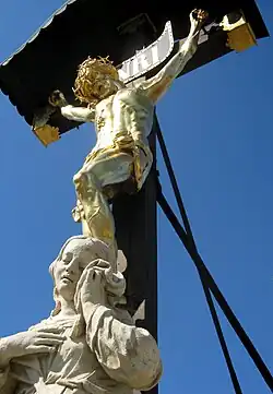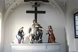Unter dem Kreuz stehen drei Sandsteinstatuen aus der Werkstatt von Jakob Schoy, an der rechten Seite die Gottesmutter Maria, auf der linken Seite Jesu Lieblingsjünger Johannes und zu seinen Füßen Maria Magdalena. Die aus der Barockzeit stammenden Figuren wurden mehrmals überarbeitet. Die Holzplastiken der beiden mit Jesus gekreuzigten Verbrecher stammen aus der Werkstatt des Bildhauers Jakob Gschiel. Sie wurden im Jahr 1880 geschaffen. Trotz aller Veränderungen entspricht die Gesamtkomposition noch jener der ursprünglichen aus der Entstehungszeit.[30] Die Reihenfolge der Abbildungen in der Galerie entspricht der Reihenfolge der Statuen und Figuren der Kreuzigungsgruppe (von links nach rechts):