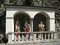 Vor der Mariatroster Kapelle ist eine kleine Nischenkapelle in den Felsen des Austeins geschlagen. Die Kapelle hat die Form einer Doppelarkade und wurde um 1660 errichtet, also vor dem Bau der Mariatroster Kapelle. Ursprünglich befanden sich in der Nische zwei Frauengestalten. Diese Konstellation wurde zwischen 1710 und 1725 durch die heute bestehende Figurengruppe der drei Marien ersetzt. Sie wird der Werkstatt des Künstlers Johann Jacob Schoy zugeschrieben. Die trauernden Frauen am Grab sind Maria, die Mutter Jesu, Maria Magdalena und Maria Salome, die im Evangelium auch „die andere Maria“ genannt wird.[41] Diese Frauen waren nach dem Markusevangelium bei der Kreuzigung anwesend und fanden als erste nach der Auferstehung Jesu das leere Grab vor.