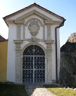 Maria-Magdalena-Kapelle (3) um 1660 Die Kapelle hat einen rechteckigen Grundriss, ein Zeltdach und ein Kreuzgewölbe. Das Rundbogensteinportal hat schmiedeeiserne Gitterflügel und ein Oberlichtgitter aus der Bauzeit.[33] In der Kapelle befindet sich eine gefasste Barockfigur der Maria Magdalena.[34]