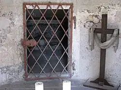 Grabkapelle (12) 1654 Die Grabkapelle ist das älteste Gebäude des Grazer Kalvarienberges. An den quadratischen Vorraum schließt eine halbrunde Grabkammer an. Die Dachlaterne mit zwölf Säulen soll an die Jerusalemer Grabeskirche erinnern. Über dem Portal ist das Wappen der Freiherren von Maschwander zu sehen, der Gründer und Erbauer des Kalvarienberges.[41] Im Vorraum liegt ein flacher Stein, eine Nachbildung des Steins vom Grab Jesu Christi. Hinter einer Wandöffnung liegt eine Figur, die Jesus im Grab darstellt.[41]