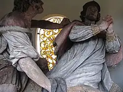Geißelungskapelle (1) um 1660 Die kleine Kapelle ist an die nordöstliche Kirchenrückseite angebaut. Sie hat einen rechteckigen Grundriss und einen Dreiecksgiebel.[31] Der Künstler Jakob Gschiel schuf im Jahr 1882 die Figurengruppe aus Sandstein. Dargestellt wird die Geißelung Christi durch zwei Männer.[29]