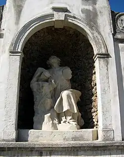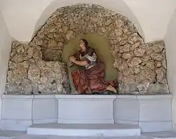 Petrusgrotte (2) Ende 19. Jh. Die Petrusgrotte ist eine Nischenkapelle und wurde als künstliche Grotte errichtet. Die Szene mit Petrus, der sein Verhalten am Morgen des Karfreitags bereut, als er Jesus verleugnet hatte, gehört nicht zu den eigentlichen Kreuzwegstationen.[32] Johann Jacob Schoy schuf möglicherweise um 1722 die barocke Steinfigur, die in der künstlichen Felsgrotte aufgestellt ist.[32]