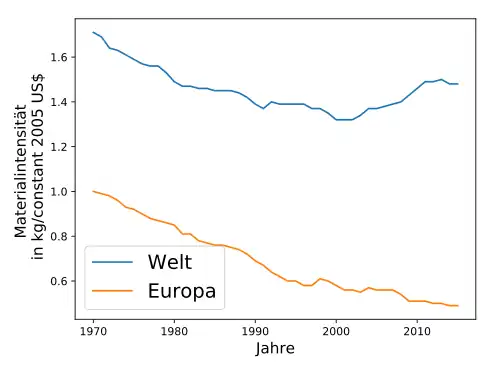 Laut International Resource Panel des Umweltprogramms der Vereinten Nationen wächst etwa seit der Jahrtausendwende der globale Rohstoffverbrauch wieder schneller als die Wirtschaftsleistung. Die Materialintensität nimmt also zu, der Kehrwert der Rohstoffeffizienz also ab („recoupling“ statt „decoupling“).[47][73][74]
