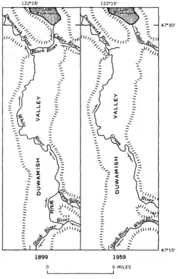 Bis 1906 floss der Green River in Downtown Auburn in den White River. In jenem Jahr jedoch änderte der White River oberhalb von Auburn seinen Verlauf nach einer Jahrhundertflut und ergoss sich fortan in den Puyallup River; dies ist auch heute noch so. Der Unterlauf des historischen White River – von der historischen Mündung des Green River in den White River bis zur historischen Mündung des Black River bei Tukwila, wo der Duwamish entsteht – gilt heute als Teil des Green River. Später, mit der Eröffnung des Lake Washington Ship Canal 1916, sank der Spiegel des Sees um fast neun Fuß (2,7 m) und der Black River trocknete aus. Seit dieser Zeit ist der Ort, ab dem der Fluss Duwamish heißt, kein Zusammenfluss mehrerer Flüsse mehr, obwohl sich der Ort selbst nicht verändert hat. Daher wird der Green River zum Duwamish River, indem er in das industrialisierte Ästuar eintritt, das allgemein als Duwamish Waterway bekannt ist; in Seattle mündet der Fluss in die Elliott Bay, eine Bucht des Puget Sound. Im Gegensatz dazu wendet sich der White River bei Auburn nach Süden und fließt in den Puyallup River, welcher in Tacoma in die Commencement Bay, gleichfalls eine Bucht des Puget Sound, mündet.[5]