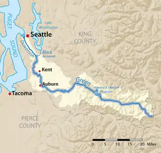 ![]() Karte des Einzugsgebietes des Green River/Duwamish River, Lauf des Green River hervorgehoben | ||