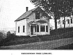 Die Greensboro Free Library wurde am 30. März 1843 erstmals erwähnt, als die Greensboro town Library von Henry Blake an John L. Porter verkauft wurde.[12]