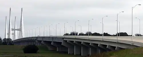 An die Schrägseilbrücke schließen sich die Zufahrten aus einer Vielzahl aus Balkenbrücken an. Auf der Arkansas-Seite haben diese eine Gesamtlänge von 1402 m, ruhen auf 35 Brückenpfeilern einschließlich Widerlager und bestehen hauptsächlich aus 36 m langen Stahlbetonbalken mit integrierten Doppel-T-Profilstahlträgern, die jeweils vier Pfeiler überspannen (drei Spannweiten). Über dem Hochwasserdamm wurde eine 279 m lange Plattenbalkenbrücke integriert mit einer Spannweite von 110 m über dem Damm. Auf der Mississippi-Seite besitzen die Stahlbetonbalken eine Länge von 42 m und die Plattenbalkenbrücke über dem Hochwasserdamm 253 m (Spannweite 100 m). Die Balkenbrücken ruhen hier auf insgesamt 50 Brückenpfeilern und haben eine Gesamtlänge bis zum Widerlager von 1952 m.[5][8]