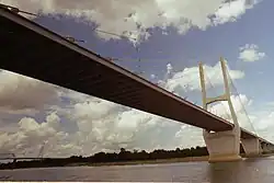 Der 31 m breite Fahrbahnträger wurde im Freivorbau aus vorgefertigten 15 m langen Stahlsegmenten zusammengesetzt, die von je einem Schrägseilpaar getragen werden. Pro Brückenseite sind insgesamt 4×14 Schrägseile im Fächersystem montiert, wobei die jeweils äußeren drei am Brückenende parallel verlaufen. Der Stahlträger ist mit einer Stahlbetondeckschicht versehen und bietet je zwei 3,6-m-Fahrbahnen pro Fahrtrichtung – mit entsprechenden Seitenstreifen – Platz.[6][7]
