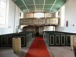 Die ursprünglich flache Balkendecke wurde später durch ein hölzernes Tonnengewölbe und 1852 durch eine leicht gewölbte Spiegeldecke ersetzt. Als evangelisch-reformierte Predigtkirche verzichtet die heutige Kirche auf Kreuz und Altar. Mittelpunkt der Kirche ist die Kanzel aus dem Jahre 1669. Sie zeigt Blumengirlanden in barocker Schnitzkunst. Innen über dem Osteingang befindet sich die Orgelempore. Über dem Westeingang der Kirche ist das Familienwappen der Cirksenas aus Greetsiel sowie das Wappen des schwedischen Königshauses Wasa zu sehen, mit dem die Cirksenas durch Heirat verbunden waren. An der Westseite der Kirche ist eine weitere Empore eingebaut, die mit Bibelsprüchen verziert ist.