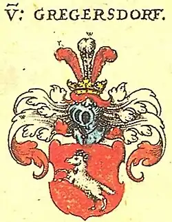 - ↑ Johannes Sinapius: Die von Gregersdorff. In: Des schlesischen Adels, anderer Theil, oder Fortsetzung Schlesischer Curiositäten. Verlag für Kunstreprod., Leipzig 1728, ISBN 978-3-89557-105-3, S. 647.