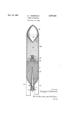 - ↑ a b c Patent US2579323A: Rocket projectile. Angemeldet am 14. Februar 1944, veröffentlicht am 18. Dezember 1951, Anmelder: Gergory J. Kessenich, Erfinder: Pauline C. Kessenich et al.