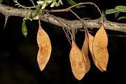 Es werden nicht öffnende, bis 7 Zentimeter lange, grau-bräunliche, flache und kahle Hülsenfrüchte, mit bis zu vier, aber oft nur mit einem bis zwei nierenförmigen und rötlich-braunen, stark abgeflachten Samen gebildet. Die Samen sind etwa 8 bis 9 Millimeter lang und nur 0,5 bis 0,7 Millimeter dick.[18]