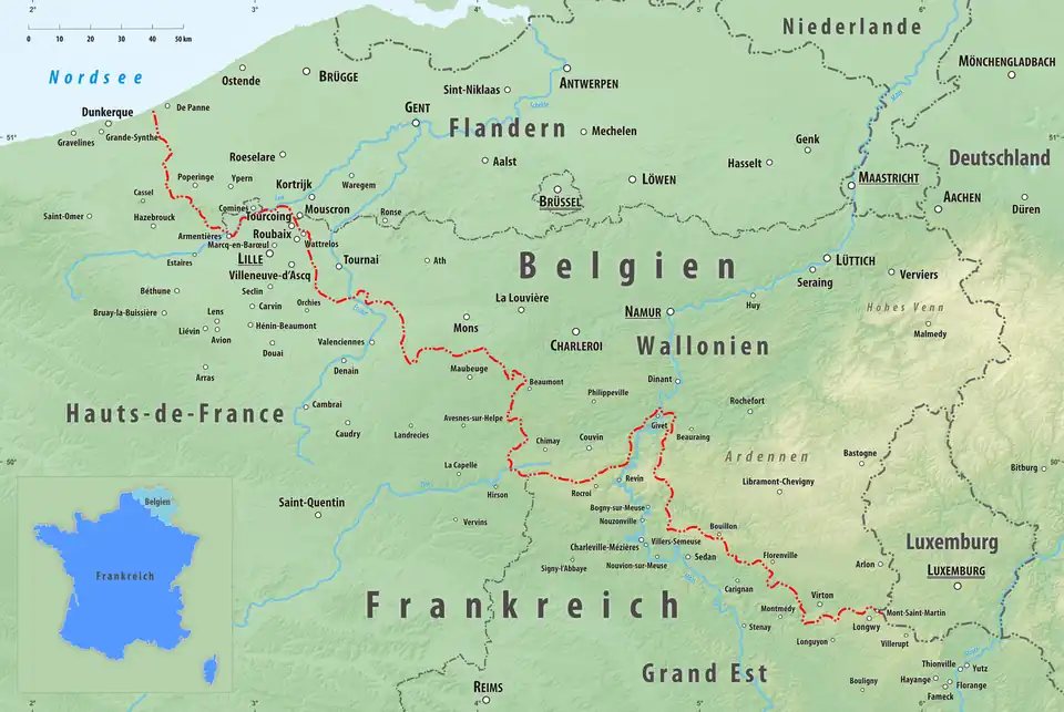 Die Grenze zwischen Belgien und Frankreich hat eine Länge von 556 Kilometern.[1]