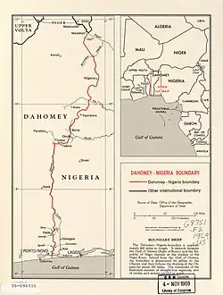Die verschiedenen britischen Protektoratsgebiete in Nigeria wurden 1914 zur Kolonie Nigeria vereinigt. Frankreich schloss 1851 einen Freundschaftsvertrag mit dem afrikanischen Königreich Dahomey; 1863 schuf es das Protektorat von Porto-Novo.[1] Am 10. September 1885 schloss Portugal im Hinterland von São João Baptista d’Ajudá einen Vertrag mit dem Königreich Dahomey, durch den es Anfang 1886 das Protektorat über die gesamte Küste von Dahomey übernahm.[2] 1892 fiel Dahomey jedoch an Frankreich. Französische Truppen, größtenteils afrikanischen Ursprungs, eroberten Dahomey zwischen 1892 und 1894 endgültig und das Land wurde zur Kolonie Dahomey, die 1899 Teil von Französisch-Westafrika (AOF) wurde. Die portugiesische Herrschaft über das kleine (4,5 ha) Gebiet von São João Baptista d’Ajudá (heute Teil der Stadt Ouidah) dauerte bis zur gewaltsamen Besetzung im Jahr 1961 (ein Jahr nach der Unabhängigkeit Dahomeys), die 1975 von Portugal anerkannt wurde. Die Grenze zwischen dem britischen und dem französischen Kolonialgebiet wurde am 10. August 1889 und genauer am 12. Oktober 1896 festgelegt und in einem Vertrag vom 14. Juni 1898 bestätigt und bis zum Lauf des Niger verlängert. Eine weitere Bestätigung erfolgte mit Vertrag vom 19. Oktober 1906. 1912 wurden kleinere Änderungen vorgenommen (hierzu Notenwechsel von 1914). Der Abschnitt zwischen der Küste und dem Okpara wurde mit 142 Betongrenzsteinen markiert.[1] Die Kolonialzeit endete 1960; Dahomey wurde am 1. August unabhängig, Nigeria am 1. Oktober. Dahomey nahm 1975 die Bezeichnung Volksrepublik Benin und 1990 Republik Benin an. Grenzkonflikte und verschwundene Grenzsteine führten in den 2000er Jahren zu Problemen, die aber 2009 als gelöst galten, bis es 2013 zu einer nigerianischen Militäraktion in Malanville kam.