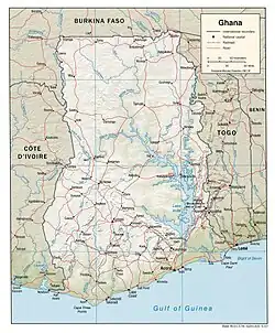 Vom Dreiländereck mit Burkina Faso (9°29'24"N, 2°41'24"W) am Schwarzen Volta (Black Volta, Volta Noire) folgt die Grenze dem Flusslauf flussaufwärts nach Norden bis zum 11. nördlichen Breitengrad.[1] Von dort verläuft sie, im Wesentlichen dem Breitengrad folgend, weiter nach Osten und lässt Léo in Burkina Faso und Navrongo in Ghana, bis zum Roten Volta oder Nazinon, dem sie rund 20 km nach Süden folgt. Weiter führt sie in einer Reihe von unregelmäßigen Linien nach Nordosten zum Weißen Volta oder Nakambé und weiter nach Osten, dabei Bawku in Ghana lassend, bis zum Dreiländereck mit Togo (11°8'24"N, 0°8'24"W).