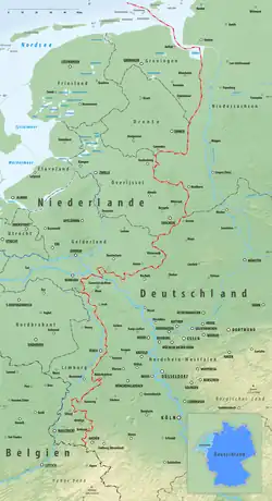 Die Grenze zwischen Deutschland und den Niederlanden hat eine Länge von 567 Kilometern (ohne Dollart und im Außenbereich der Ems).[1] Auf der niederländischen Seite grenzen die Provinzen Groningen, Drenthe, Overijssel, Gelderland und Limburg an das Nachbarland. Auf der deutschen Seite sind es die Länder Niedersachsen und Nordrhein-Westfalen (jeweils von Nord nach Süd aufgelistet).