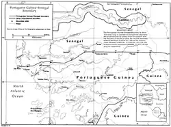 Das Gebiet des heutigen Guinea-Bissau wurde von Portugal ab der Mitte des 15. Jahrhunderts erkundet; Bissau wurde 1765 gegründet. Die portugiesische Herrschaft beschränkte sich zunächst auf wenige Niederlassungen, bis 1892 ein Militärbezirk an der Küste geschaffen wurde. Über die Insel Bolama entstand ein Streit mit dem Vereinigten Königreich, der durch einen Schiedsspruch 1870 zugunsten Portugals entschieden wurde. Frankreich, das die senegalesischen Küstengebiete schon seit dem 17. Jahrhundert zu kolonialisieren begonnen hatte, dehnte sein Einflussgebiet im späten 19. Jahrhundert aus. Das Gebiet südlich des Flusses Casamance im südlichen Senegal wurde von Frankreich beansprucht und diesem zugesprochen; Frankreich erkannte im Gegenzug die Grenzen Portugiesisch-Guineas an.[2] Frankreich und Portugal unterzeichneten am 12. Mai 1886 ein Grenzabkommen, das die heutigen Grenzen von Guinea-Bissau mit dem Senegal und Guinea umfasste. Eine gemeinsame Grenzkommission besorgte von 1900 bis 1905 die Vermarkung im Gelände mit 184 Grenzsteinen, davon die Steine 58 bis 184 an der Grenze Senegal/Portugiesisch-Guinea. Der Grenzverlauf wurde durch einen Notenwechsel in den Jahren 1905/1906 bestätigt.[3] Bis zum Staatsstreich in Portugal vom 28. Mai 1926 war der größte Teil von Portugiesisch-Guinea unterworfen. 1951 wurde die Kolonie zur Überseeprovinz. Ab 1961 führte die Unabhängigkeitsbewegung Partido Africano da Independência da Guiné e Cabo Verde (PAICG) einen Befreiungskrieg, der nach der Nelkenrevolution in Portugal 1975 zur Unabhängigkeit von Guinea-Bissau führte.