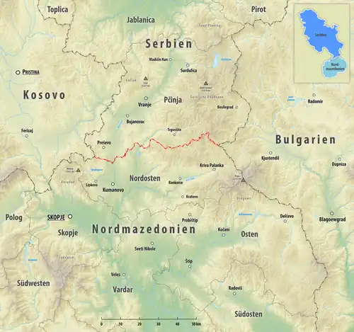 Die Grenze zwischen Nordmazedonien und Serbien trennt Nordmazedonien und Serbien.