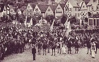Morgendliche Aufstellung der Männergesellschaften und Burschenschaften auf dem Marktplatz