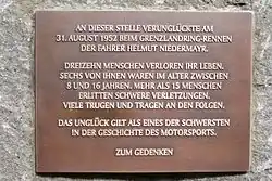 Der Unfall liegt laut Motorsport Memorial auf Rang fünf der nach Anzahl der Todesopfer schwersten Unfälle der Motorsport-Geschichte.[15] Zum 60. Jahrestag des Unfalls wurde auf Initiative des Historischen Vereins Wegberg ein Gedenkstein errichtet, der an die 13 verbrieften Todesopfer erinnert und die genaue Unfallstelle markiert, die vorher nur noch wenigen Ortskundigen bekannt war (51° 8′ 28″ N, 6° 16′ 5″ O).