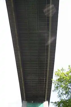 Der stählerne Überbau mit 8600 t Masse ist eine zum großen Teil geschweißte Plattenbalkenkonstruktion mit zwei vollwandigen Hauptträgern und einer orthotropen Fahrbahnplatte. Er wurde im Freivorbau mit bis zu drei Montagehilfsstützen im mittleren Feld errichtet. Die neunfeldrige Brücke besitzt Stützweiten von 65 m – 100 m – 2 × 120 m – 125 m – 2 × 120 m – 100 m – 65 m. Die Hauptträger sind im Abstand von 20,2 m angeordnet und haben am Widerlager eine Steghöhe von 4,0 m sowie in Brückenmitte von 5,8 m. Die senkrecht dazu angeordneten Querträger liegen in Abständen von 2,5 m bei Höhen von maximal 0,8 m, alle 20 m sind 2,5 m hohe Fachwerkquerträger angeordnet.