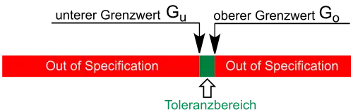 Schema zur Veranschaulichung einer beidseitig begrenzten Spezifikation (z. B. für den optischen Drehwert α). Der Toleranzbereich der Spezifikation ist grün markiert. Er beginnt mit dem unteren Grenzwert Gu und endet mit dem oberen Grenzwert Go.