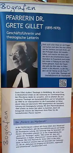- ↑ Lebenslauf, Personalakte Grete Gillet, Landeskirchliches Archiv des Evangelischen Oberkirchenrats Karlsruhe