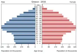 Griechenland hatte 2022 10,4 Millionen Einwohner.[33] Die Einwohnerzahl sank um 1,4 %. Zum Bevölkerungsrückgang trug ein Sterbeüberschuss (Geburtenziffer: 7,3 pro 1000 Einwohner[34] vs. Sterbeziffer: 13,4 pro 1000 Einwohner[35]) bei. Die Anzahl der Geburten pro Frau lag 2022 statistisch bei 1,4, die der Europäischen Union betrug 1,5.[36] Die Lebenserwartung der Einwohner Griechenlands ab der Geburt lag 2022 bei 80,6 Jahren[37] (Frauen: 83,3[38], Männer: 78,1[39]). Der Median des Alters der Bevölkerung lag im Jahr 2021 bei 44,7 Jahren.[40] Im Jahr 2023 waren 13,6 Prozent der Bevölkerung unter 15 Jahre,[41] während der Anteil der über 64-Jährigen 23,1 Prozent der Bevölkerung betrug.[42]