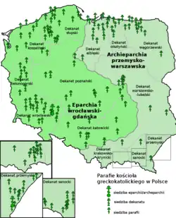 Es gibt Konkathedralen in den Eparchiesitzen Przemyśl, Warschau, Danzig, Olsztyn, Stettin und Koszalin. Daneben gibt es weitere griechisch-katholische Kirchen in polnischen Städten und Dörfern.