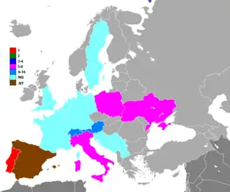 2021 Europa nicht qualifiziert Griechenland hatte sich zunächst mit dem Olympiastadion Athen für die Austragung von Spielen beworben, dann aber zurückgezogen. In der Qualifikation an Italien und Finnland gescheitert.