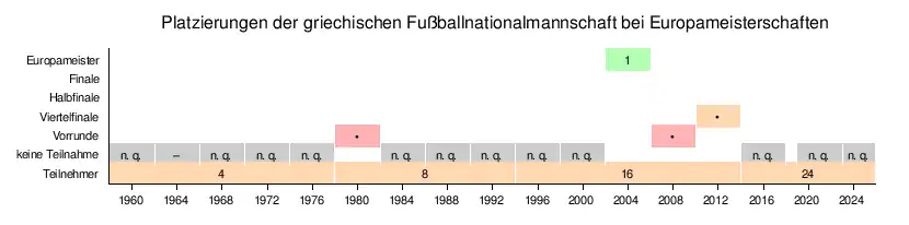Griechenland nahm viermal an der Endrunde zur Europameisterschaft teil, davon einmal bei acht Teilnehmern und dreimal mit 16 Teilnehmern.