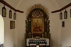 Der Innenraum der Kapelle ist tonnengewölbt über profiliertem Gesims und verfügt über einen Fußboden aus grauen Marmorplatten im Rautenmuster und weißen Wandflächen. Der kleine Altar aus Holz besitzt eine rötlich-grüne Marmorfassung und vergoldete Ornamentteile. Er stammt aus der ersten Hälfte des 19. Jahrhunderts und wurde mit Säulen, Gebälk und Rundgiebel ausgeführt. Das Altarbild zeigt als kolorierter Druck die Armen Seelen im Fegefeuer mit der darüber schwebenden Madonna mit Kind sowie Engeln. Darüber befindet sich im Auszug ein Reliefmedaillon mit Mariahilf-Bild und der Schriftzug HEILIGE MARIA BITT FÜR SIE. Zudem verfügt die Kapelle über einen Kreuzweg aus kolorierten Drucken aus der zweiten Hälfte des 19. Jahrhunderts, der 1902 eingesetzt wurde.