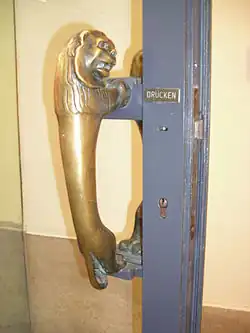Sie werden einhändig umgriffen und die Kraftausübung erfolgt durch Drehung um die Längsachse durch den Unterarm. Drehgriffe können sowohl kugelförmig als auch hebelförmig gestaltet sein.[2] Eine weitere, weniger verbreitete Version der Drehgriffe findet sich an mechanisch komplizierten Objekten, wie der Außentür von Flugzeugen, die eine Drehbewegung um die sagittale Achse zwischen Daumen und kleinem Finger erfordern.