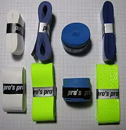 Diese Griffbänder sind oft einzeln abgepackt erhältlich und reichen von der Länge her auch bei einer etwas engeren Wicklung für jeden Schlägergriff aus. Inzwischen gibt es auch Frottee-Griffbänder, die vor allem als Meter-/Rollenware angeboten wird. Griffbänder sind in vielen verschiedenen Farben erhältlich. Ein Übergriffband sollte man halbjährlich erneuern.