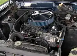 - die leistungsgesteigerte, HiPo (für High Power) genannte Version kam durch höhere Verdichtung, einen geänderten Luftfilter[13] und einen Vierfach-Fallstromvergaser von Holley[5] auf 271 bhp bei 6.500 Umdrehungen pro Minute.