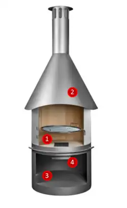 Der Grillkamin ermöglicht ein direktes Grillen. Über Lüftungsöffnungen zwischen Unterbau und Brennkammer wird die Glut stetig mit Zuluft versorgt. Durch den Kamineffekt steigen Rauch und erhitzte Luft nach oben und werden über den Rauchfang abgeführt.