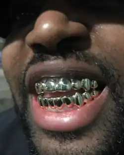 In der Hip-Hop-Kultur versteht man unter dem Begriff Grill (pl. Grills oder Grillz) ein Schmuckstück, das über den Zähnen getragen wird. Grillz werden häufig aus Silber, Gold oder Platin hergestellt.[1] Oft sind sie auch mit Diamanten oder eingravierten Schriftzügen verziert. Abhängig von Material und Anzahl der Zähne können sie sehr teuer sein. Grillz gelten als Bestandteil der Hip-Hop-Bling-Bling-Kultur.[2]