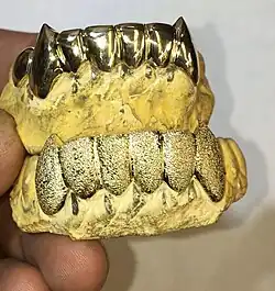 Bei Ausgrabungen in Gizeh wurden Goldschnüre gefunden, mit welchen Ersatzzähne in Zahnlücken befestigt wurden.[3] gefunden und gehen auf das 16. Jahrhundert v. Chr. zurück. Es ist jedoch unklar, ob diese von den Ägyptern im Alltag getragen oder nachträglich während des Prozesses der Mumifizierung angebracht wurden.[4]